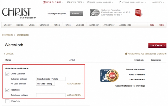 Das Gutscheinfeld im Warenkorb bei CHRIST heißt: Rabattcode