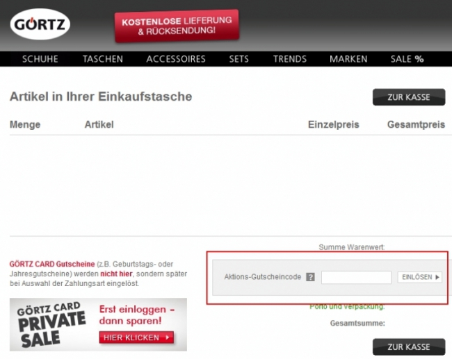 Das Gutscheinfeld im Warenkorb bei Görtz heißt: Aktions-Gutscheincode