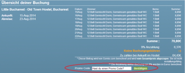 Stell Dir Deine Hostelübernachtung weltweit auf gomio zusammen und reduziere Deine Rechnung ganz einfach, indem Du in der Übersicht Deiner Buchung einen Promo Code, also einen Gutscheincode einlöst!