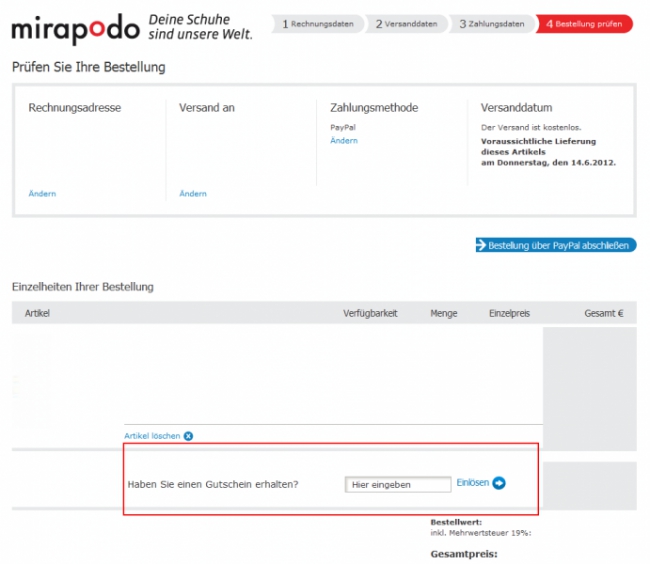 Das Gutscheinfeld im Warenkorb bei mirapodo heißt: Gutschein