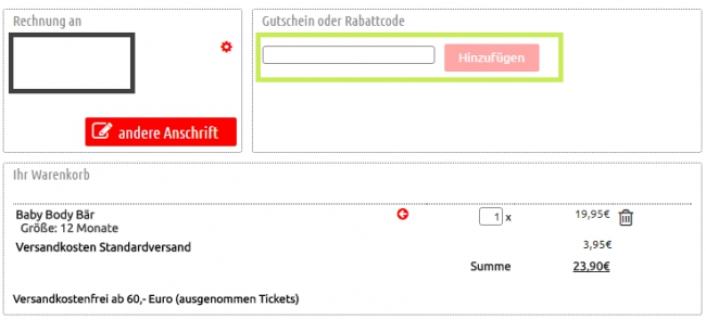 Um einen Union Zeughaus Gutschein einlösen zu können, musst Du Dich zunächst einmal anmelden oder in ein bestehenden Kundenaccount einloggen. Dann findest Du das dafür vorgesehene Feld im letzten Bestrellschritt über dem Warenkorb-Inhalt.